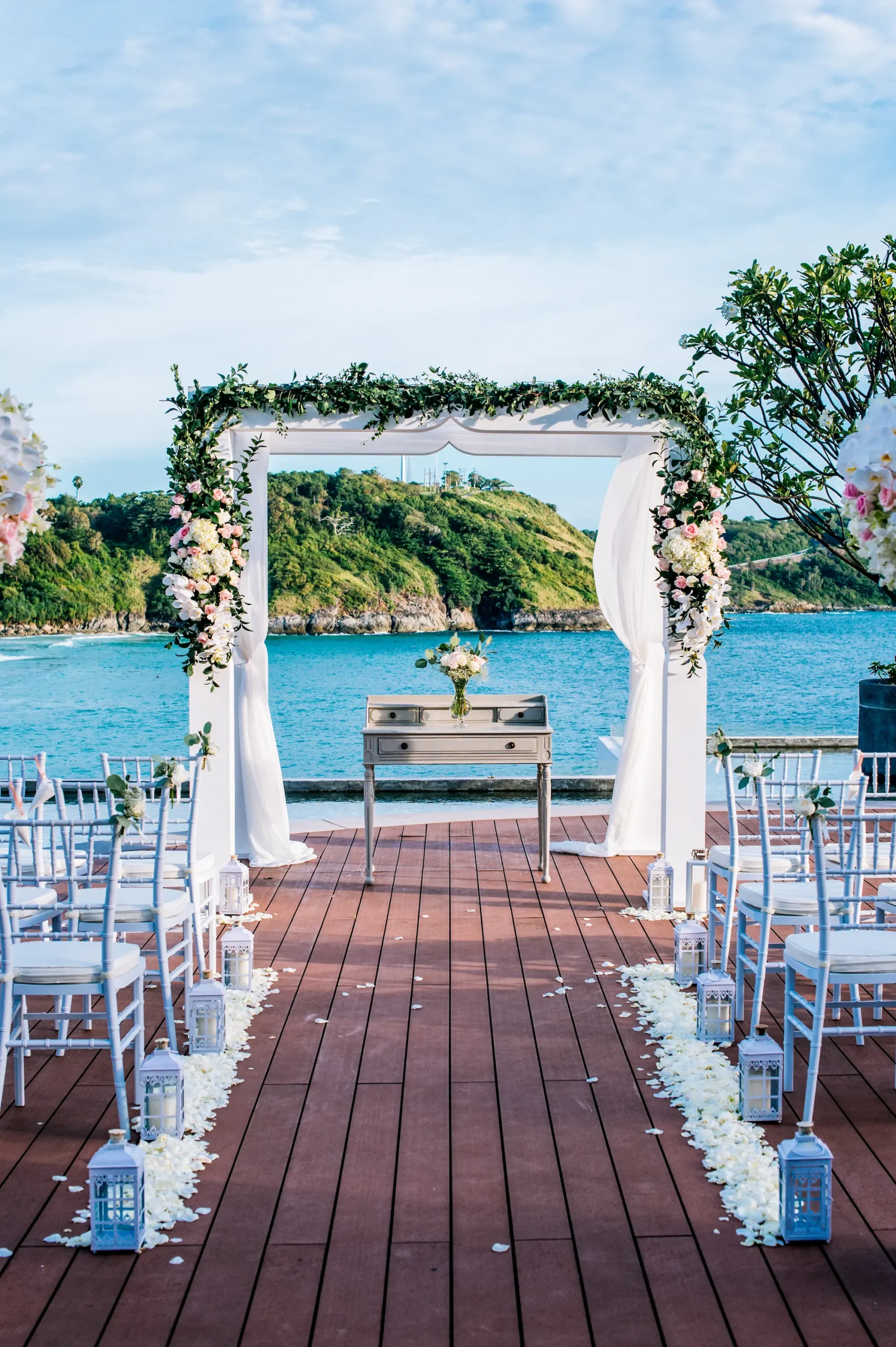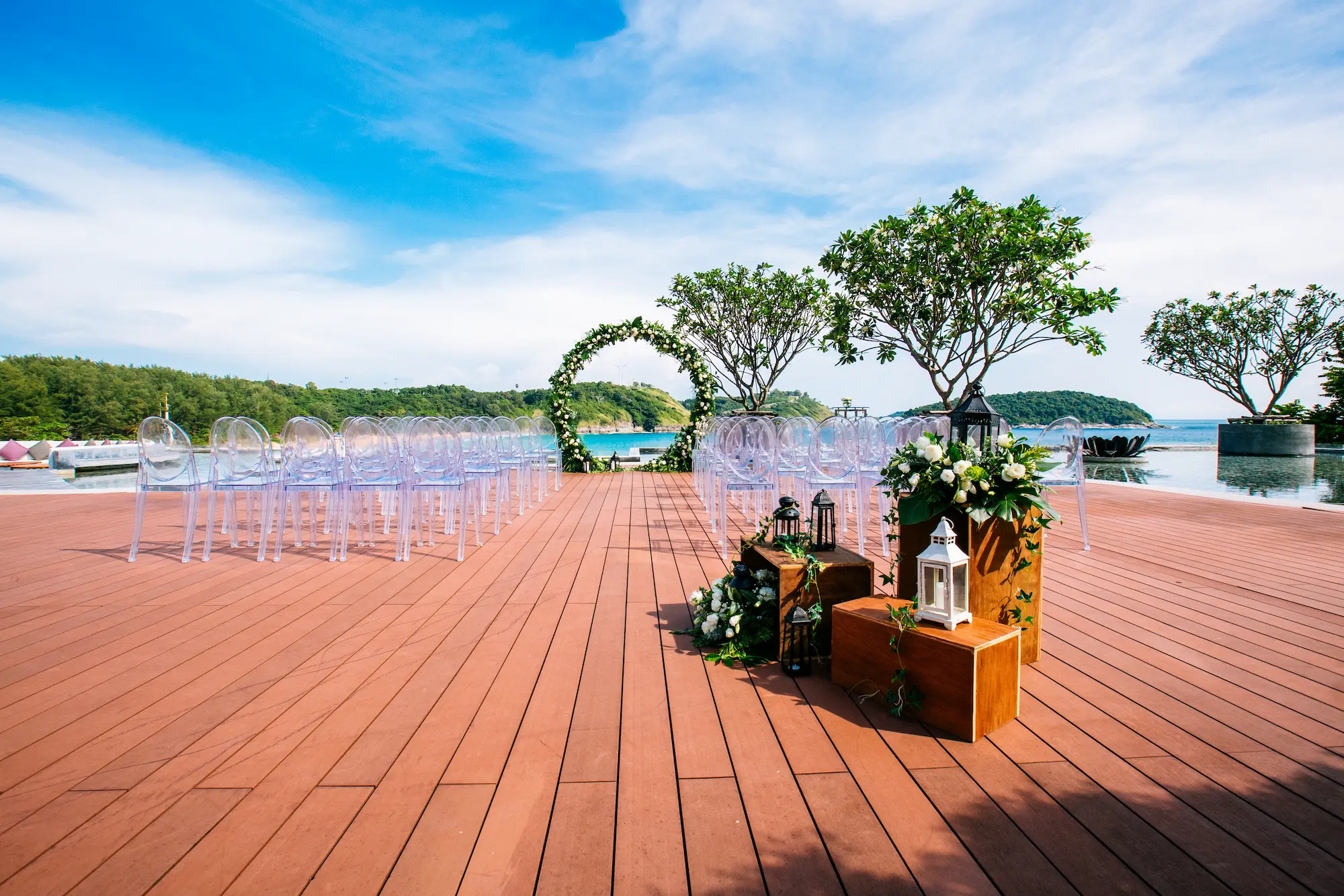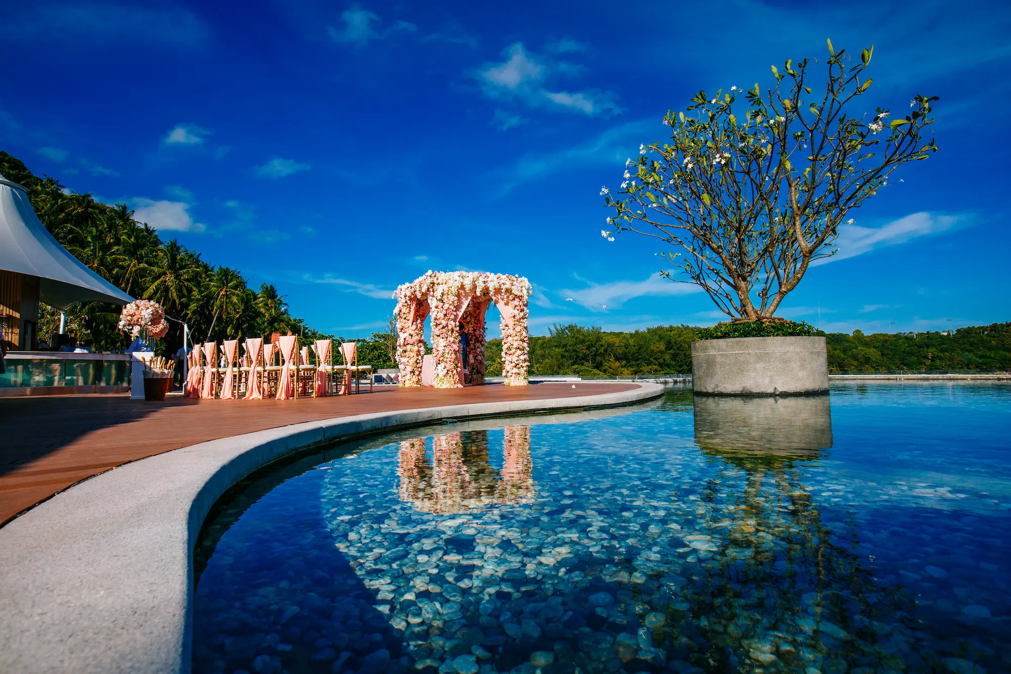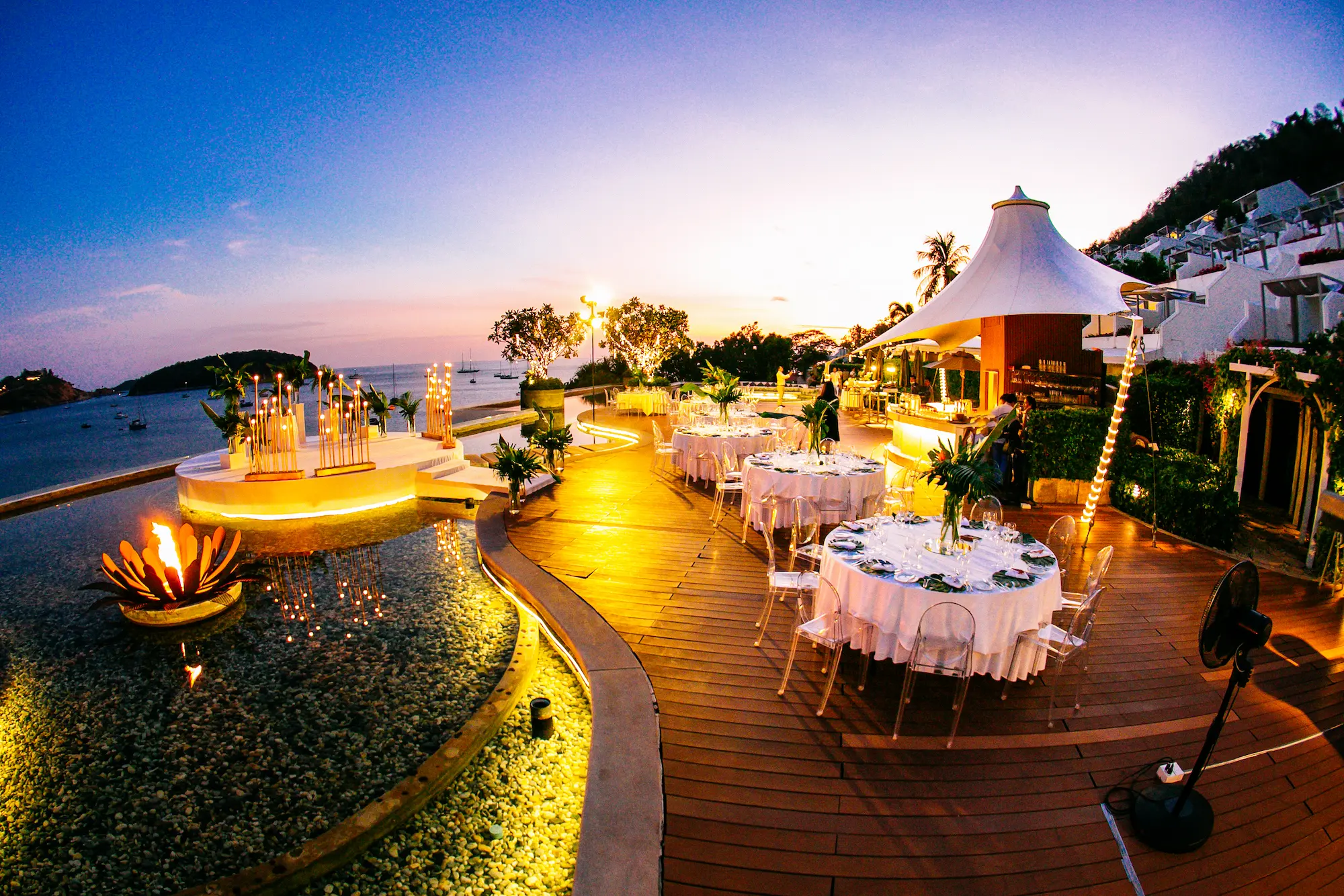 The only hotel right on the beautiful Nai Harn Bay, this property is also the only Phuket member of the Leading Hotels of the World. The Poolside Deck is the ideal location for the ceremony, featuring a scenographic platform in the middle of the pool for the bridal couple to exchange vows on. Wonderful photographs guaranteed. For the reception we suggest moving to the large restaurant downstairs, where a private area can be reserved for the wedding party.