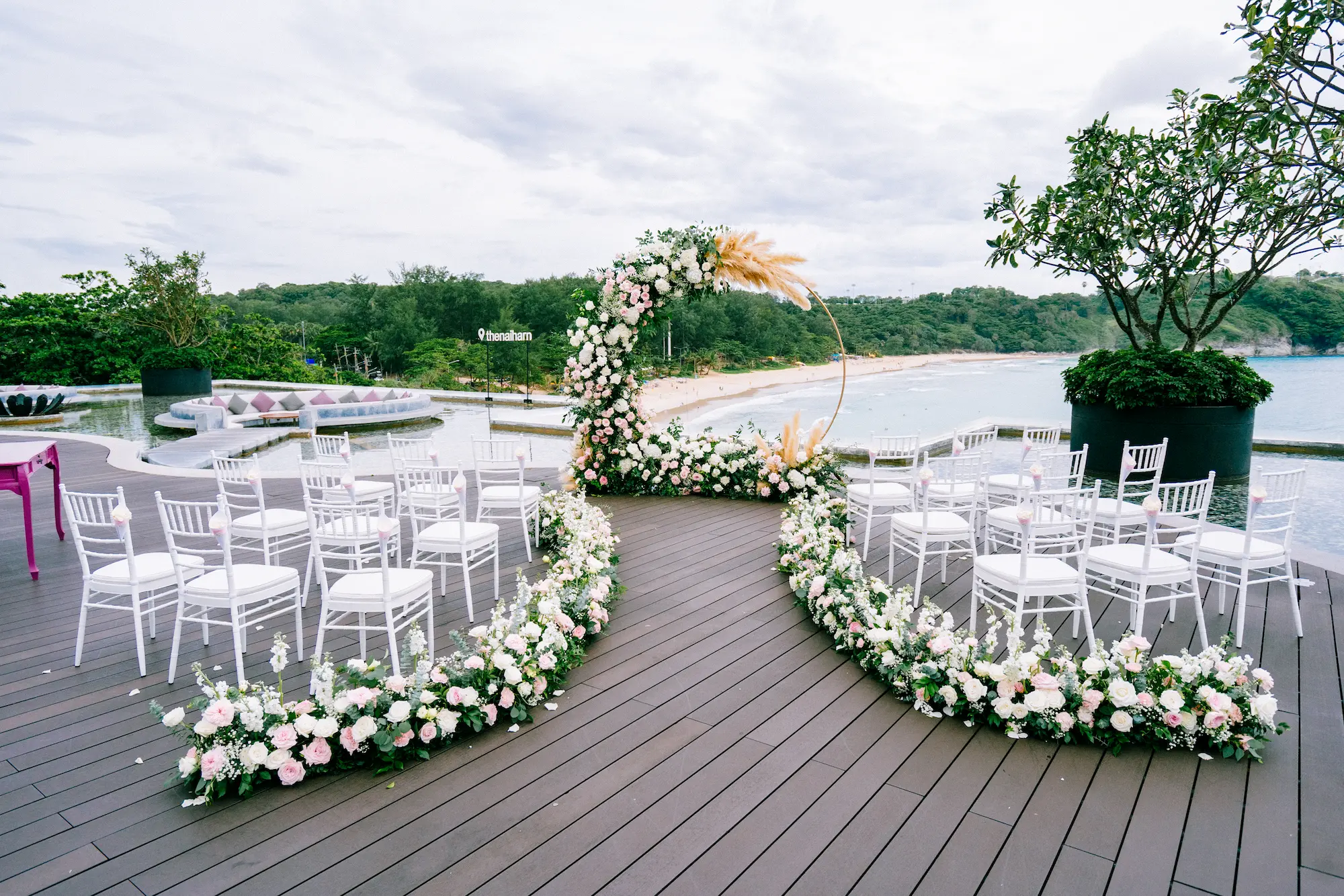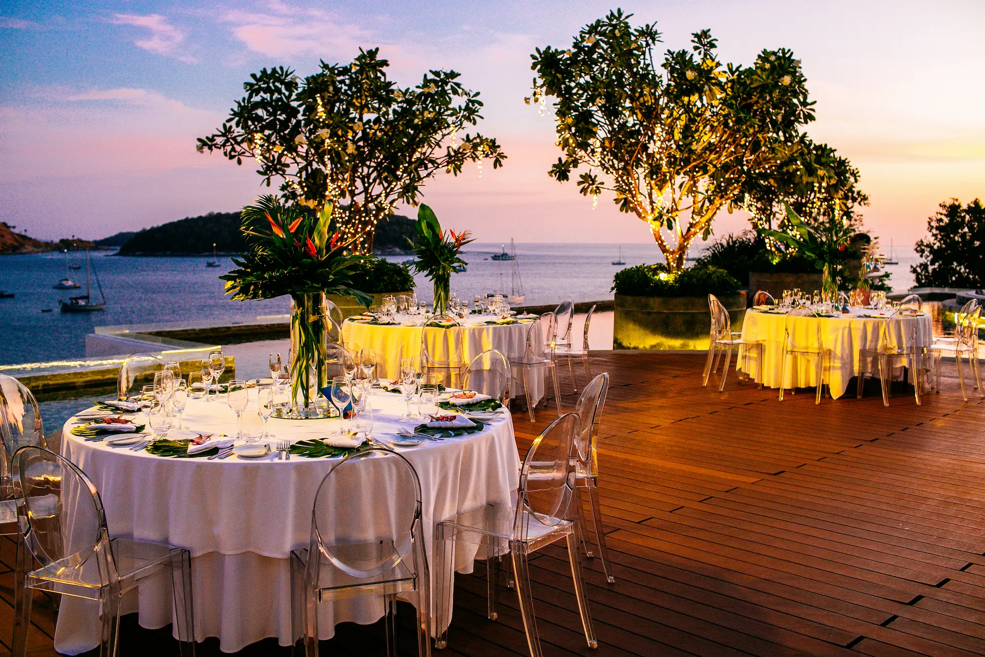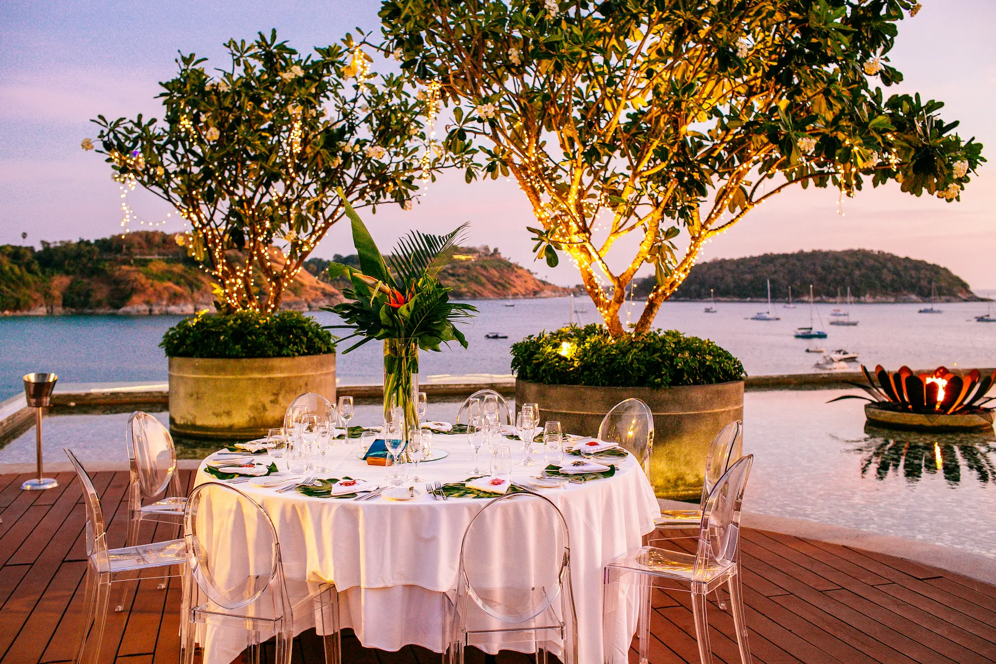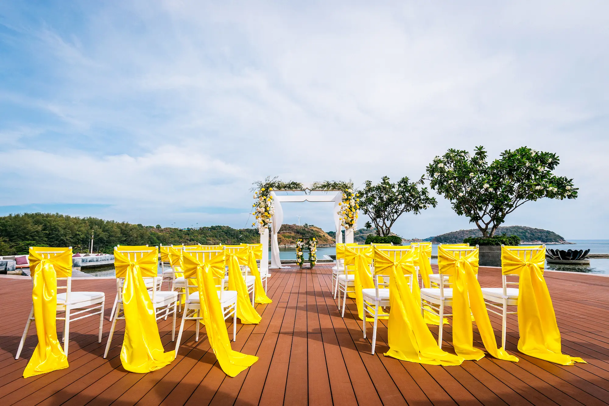 The only hotel right on the beautiful Nai Harn Bay, this property is also the only Phuket member of the Leading Hotels of the World. The Poolside Deck is the ideal location for the ceremony, featuring a scenographic platform in the middle of the pool for the bridal couple to exchange vows on. Wonderful photographs guaranteed. For the reception we suggest moving to the large restaurant downstairs, where a private area can be reserved for the wedding party.