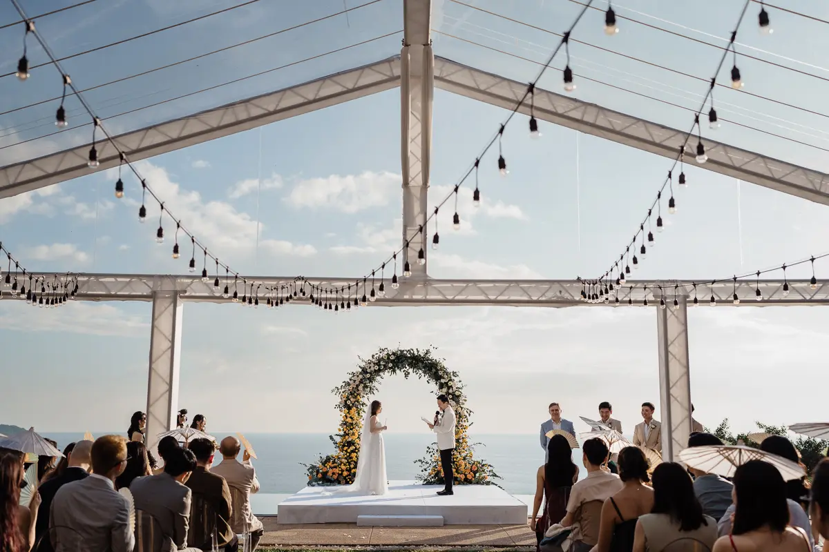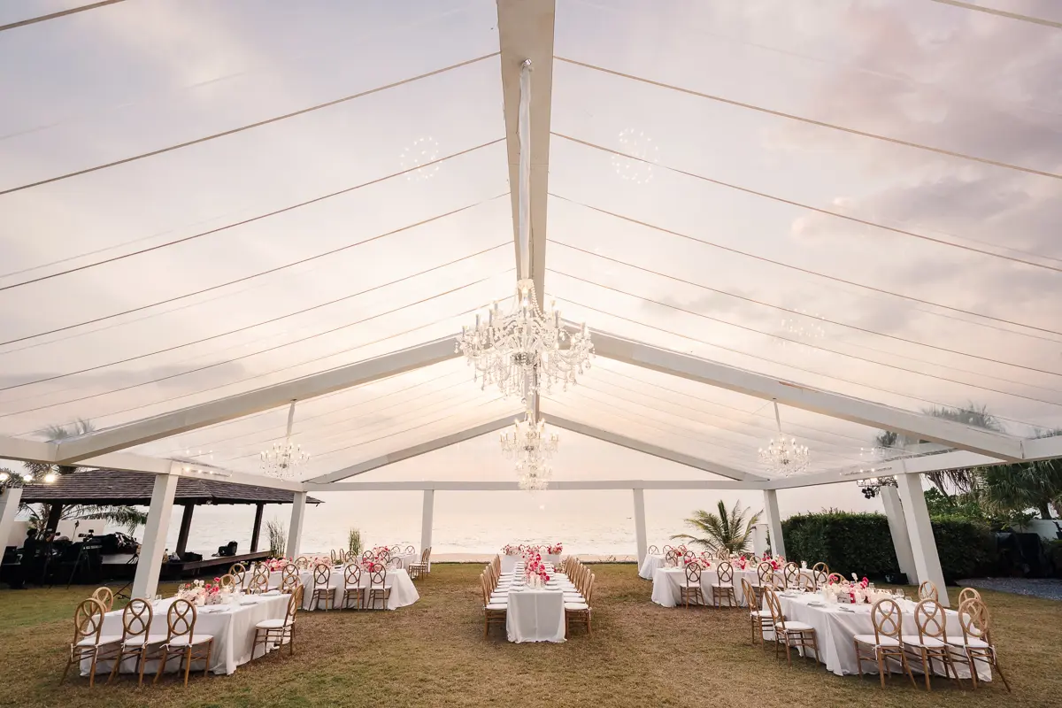 Marquees are a common and versatile solution. While most properties don’t keep these on-site, any experienced wedding planner can connect you with reliable rental companies. Marquees come in various styles and sizes, suitable for both beach and lawn setups. Be prepared for the cost though – prices start around 6,000 USD and can go much higher for bigger setups.
