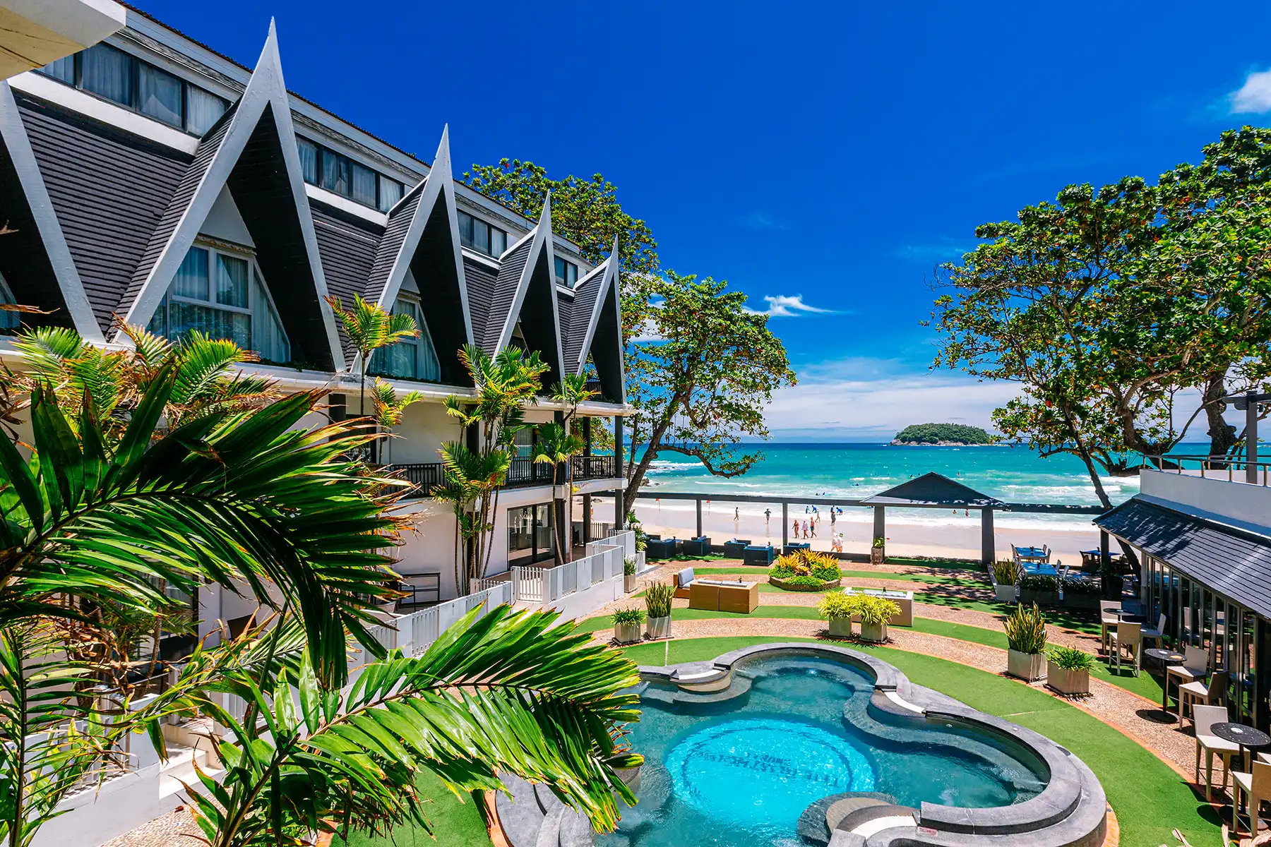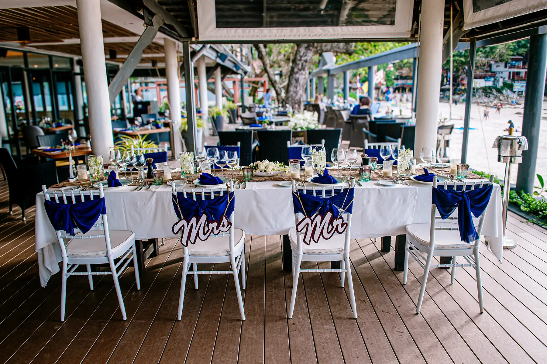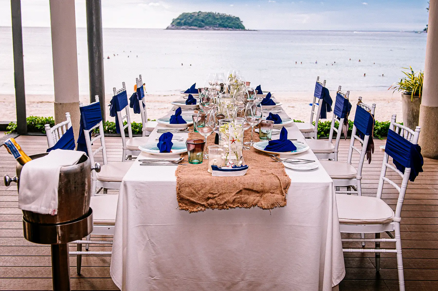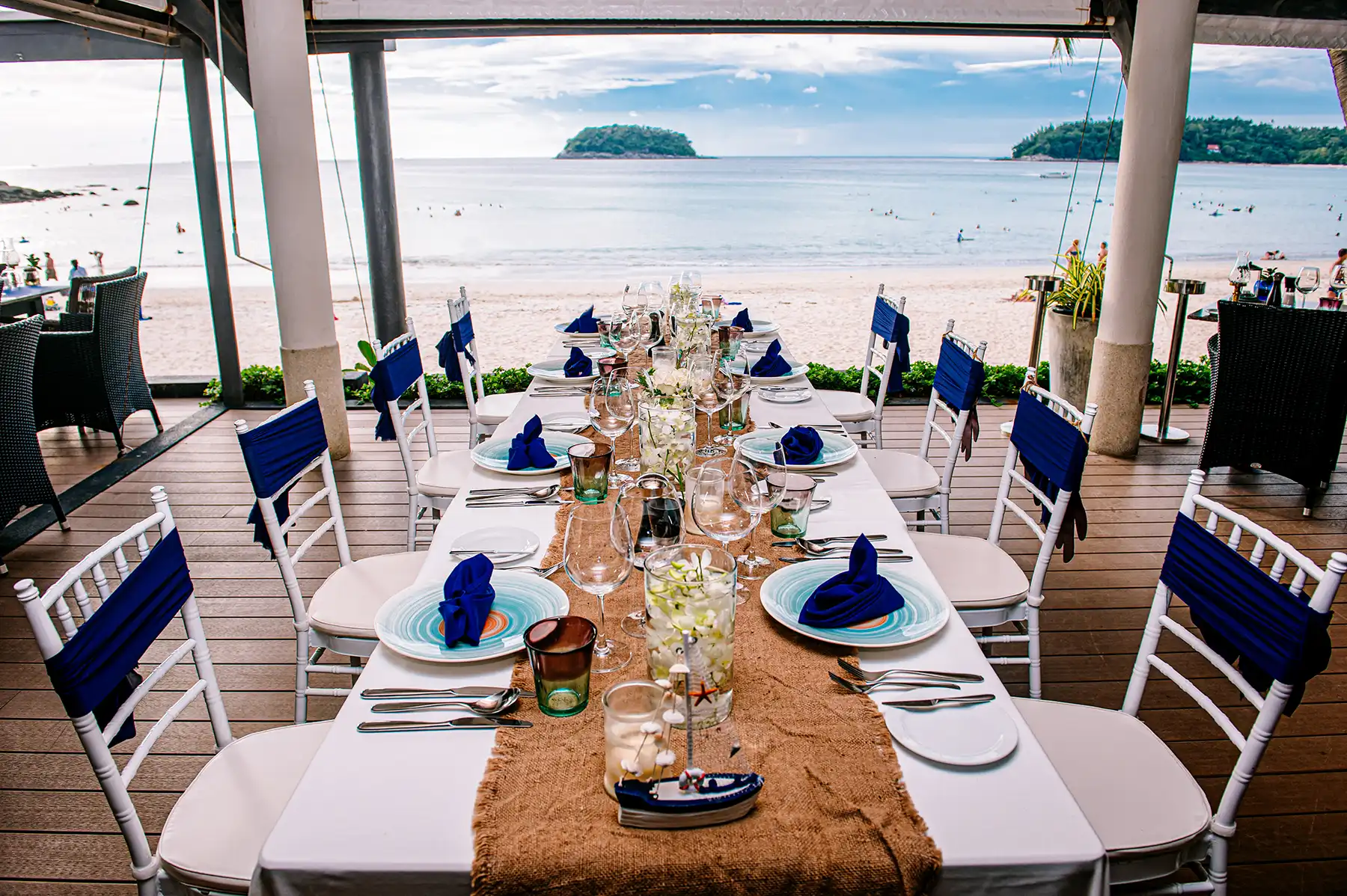The Boathouse is an intimate boutique resort, nested on the southernmost corner of Kata beach. Its classic yacht club decor, dominated by white and blue, offers timeless elegance and a splash of nautical charm. The wedding ceremony can take place either right on the beach or on the upper panoramic terrace, both options sharing the same stunning ocean view, with a little green island sitting perfectly at the center of the horizon. For the reception our recommendation is to choose the Boathouse Restaurant, a culinary gem with nice ambiance and ample panoramic windows. Alternatively, for small groups of less than 30 guests, the indoor Pool Bar can also be a lovely choice.